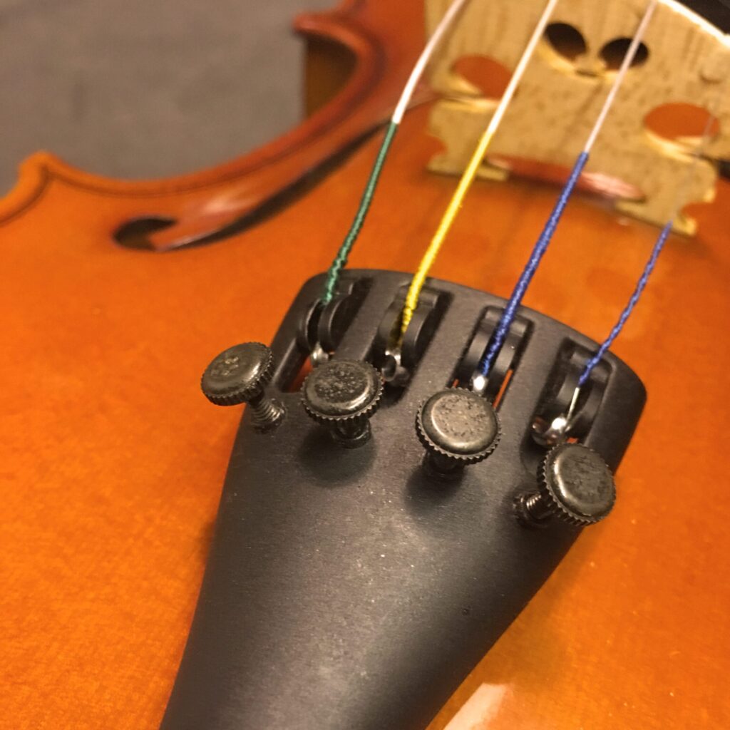 Professional players avoid fine tuners but this is purely down to their experience and confidence in the quality of their strings. Most student instruments will have fine tuners which are great for all players who are still learning, and more importantly learning to “hear” the tuning of the violin/viola. The fine tuners are at the bottom of the strings and ideally you would want all four fine tuners – there are options not to have all four if required. The work by turning them like a screw and only need moving a tiny bit at a time. The fine tuners are found on the tailpiece.