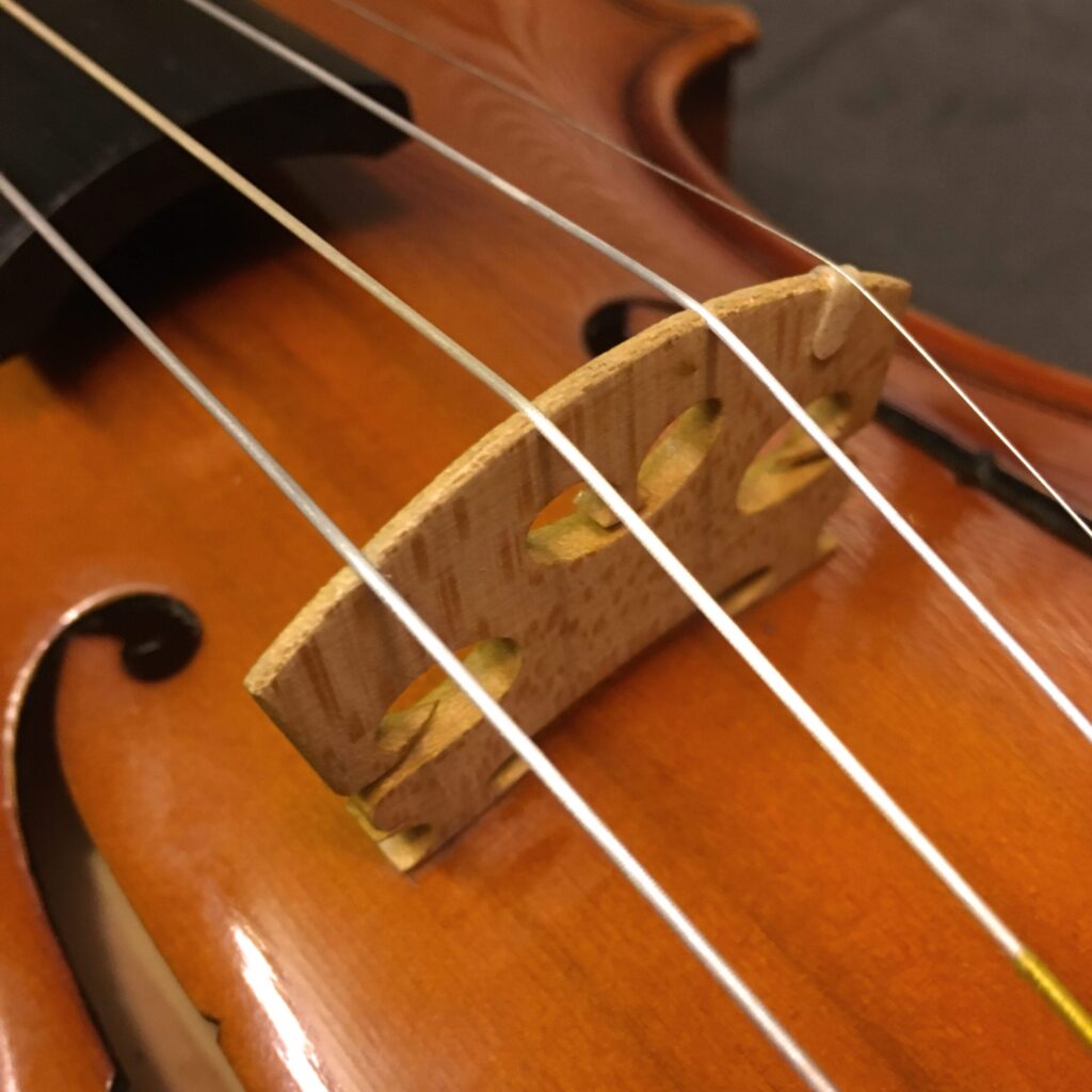The bridge on a violin/viola is crucial to being able to create a lovely sound. A good fitted bridge enables players to play in the style that they need to. Surprisingly different styles of playing require different styles of bridge. The bridge will have small grooves cut out to enable the strings to sit in the correct place and the top string which is very thin will also sit on a small plastic tube to stop it snapping too easily or being cut by the wood.