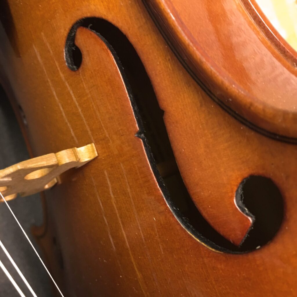 The sound post is a round post that sits front to back inside the violin/viola and is crucial to the sound of the violin/viola. To see the sound post you need to look inside the violin or viola – the sound post is slightly thinner than a pencil and isn’t an obvious feature that non string players know about. The sound post is key to a good sound and it helps supports the structure of the violin/viola from the pressure of the tension of the strings.