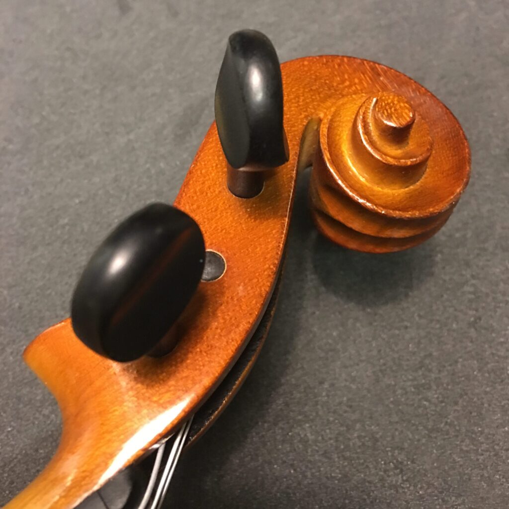 The tuning pegs and pegbox are located at the top of the instrument under the scroll. The strings are attached to the tuning pegs which are contained within the pegbox. The strings are inserted into a hole in the tuning pegs and attached to the tuning pegs. They are wound around the pegs but generally aren’t used as much these days to tune the violin/viola due to fine tuners/adjusters at the other end of the violin/viola.