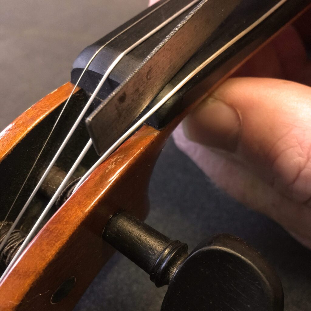 Any new violin or viola will need the violin/viola nut adjusting so the strings are the correct height form the fingerboard. If the string is too high the violin/viola becomes harder to play, especially for a beginner. Even the smallest adjustment can make a huge difference to the player. The nut slots also have to be filed at the correct angle, and a small amount of graphite dust is inserted making the string glide over the nut which will also help with tuning.